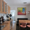 Küche mit Kühl/Gefrierschrank, Geschirrspüler und Backofen/Mikrowelle. Esstisch mit Sitzbank und zwei Sesseln.