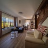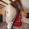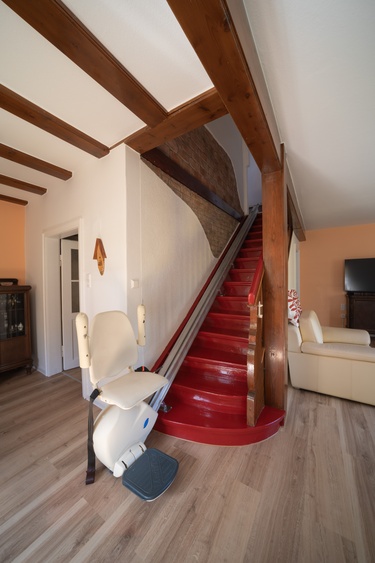 Die Treppe in 1. OG verfügt über einen Treppenlift. Im Obergeschoß befinden sich 2 Schlafzimmer, jeweils mit einem Boxspringbett ausgestattet, und das Badezimmer mit Eckbadewanne, WC und Waschbecken
