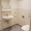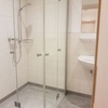 Badezimmer mit großer Dusche, WC und Waschbecken.
