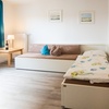 Die Wohnung HABEL leigt im 1.OG. Sie besteht aus einem Durchgangs- oder Ankleidezimmer, einer Ess-Koch-Küche, einem modernen Duschbad mit WC und einem kombiniert nutzbaren Wohn-Schlafzimmer. Zum Objekt gehören ein Parkplatz und eine Terrasse im gemütlichen Dünengarten mit Strandkrob. Sie kostet ab 55,00€/Nacht.