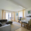 Vom Wohnzimmer aus haben Sie Zugang zu Ihrer eigenen überdachten Terrasse mit Strandkorb, Gartenliege und Essplatz.