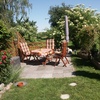 Auf ihrer Terrasse steht ein Holztisch mit 2 Holzstühlen mit verstellbarer Rückenlehne (mit 2 Auflagen) mit 2 Fußhockern, sowie ein Sonnenschirm.