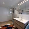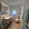 Sie finden ein modernes Bad mit ebenerdiger Dusche, Waschbecken, WC, Waschmaschine und Tageslicht vor.