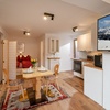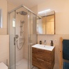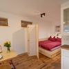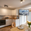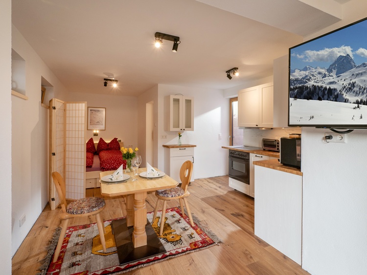 Das Apprtment ist ca 25 qm gross, verfügt über ein Doppelbett 150 x 200 cm, ein grosse Glasfront mit freiem Blick zum Berg.