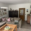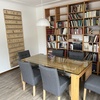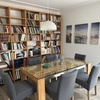 mit Couch, Sessel und Fernseher. Der Esszimmerbereich hat eine große Bücherwand und einen Esszimmertisch mit 6 Stühlen.
