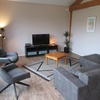 Wohnzimmer: Interaktiver Full-HD-Fernseher, DAB-Radio, WLAN, geräumiger Esstisch, Sitzecke mit zwei Stühlen und Ecksofa.