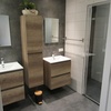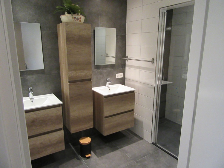 Badezimmer: Dusche mit Thermostatarmatur, Waschtisch mit Doppelwaschbecken und zwei Kleiderschränke.