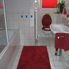 Im Bad finden Sie eine Badewanne mit Duschtrennwand, Waschbecken, WC und ausreichend Abstellfläche für Ihre Toilettenartikel.