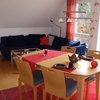 Im Wohnzimmer finden Sie eine bequeme Eckcouch, auf der man auch schlafen kann, eine Regalwand mit Vitrine und reichlich Geschirr und Gläser. Der Esstisch lässt sich ausziehen, so dass den Tafelfreuden kaum Grenzen gesetzt sind.