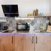 Elektroherd, Kühlschrank, Tiefkühlfach, Geschirreinrichtung, Wasserkocher, Kaffeemaschine, Besteck, Gläser
