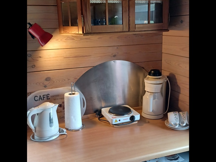 * keuken incl. koffiezetapparaat, waterkoker, koelkast, kookplaat, borden, bestek en jerrycan voor (drink)water,