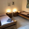 Vom Wohnzimmer aus gelangt man über den Flur in das abgeschlossene Schlafzimmer. Hier sind moderne Vollholz-Möbel, wie zwei Kanapees (Einzelbetten mit Matratze), Nachttische und ein großer Kleiderschrank, welcher ausreichend Stauraum bietet.