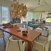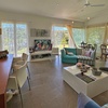 Der lange Flügel, bietet einen sehr großen Wohnraum mit diversen Sofas und einem Speisebereich, angrenzend die Küche. In allen Richtungen gibt es Glastüren zum Garten und einen wunderschönen Blick auf das Meer.