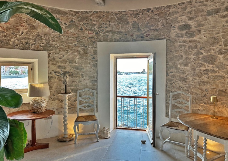 Die Wohnung besteht aus einem großen doppelten Wohnraum mit Speisebereich und einem fantastischen Blick über das das Meer, und die gesamte Strandpromenade von Marciana Marina, sowie hoch zu den Bergstädten Poggio und Marciana alta. Von dem Wohnzimmer im Turm, mit seinen antiken Steinen, gelangt man über eine moderne von der Designerin entworfene Wendeltreppe in den unteren Turmbereich, in dem sich ein Schlafzimmer mit Doppelbett befindet.