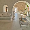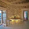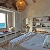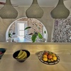 Oberhalb des Wohnraums befindet sich die voll ausgestattete Küche und davor gelagert eine Theke mit Speisebereich fuer schnelle Mahlzeiten. Entlang des Flurs, der am kleinen Platz endet, gibt es ein Badezimmer mit Dusche fuer das Turmzimmer und weiter das Doppelbettzimmer mit einem großen Badezimmer, beide mit fantastischem Meerblick.