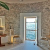Oberhalb des Wohnraums befindet sich die voll ausgestattete Küche und davor gelagert eine Theke mit Speisebereich fuer schnelle Mahlzeiten. Entlang des Flurs, der am kleinen Platz endet, gibt es ein Badezimmer mit Dusche fuer das Turmzimmer und weiter das Doppelbettzimmer mit einem großen Badezimmer, beide mit fantastischem Meerblick.