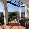 Der große möblierte Balkon lädt bereits zum Frühstücken bei Sonnenschein ein – mit Blick zum Pool und auf den Kanal.