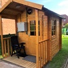 1 große doppelflügige Terrassentür führt vom WZ zur überdachten Terrasse mit Strandkorb, Abstellraum mit Holzkohlegrill, Elektrogrill und Feuerkorb. Sandkasten, großer umzäunter Garten, finnische Außensauna und PKW-Einstellplatz.