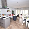Essbereich mit Tisch und Stühlen. Offene Küche mit Esstheke und Barhockern.