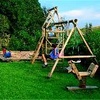 Hinter dem Haus befindet sich ein großer eingezäunter Garten mit Schaukel, Wippe und Sandkasten für die Kinder.