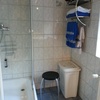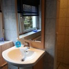 Bad mit Dusche, Waschplatz mit beleutetem Spiegel, WC und Fön.