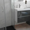 1 Badezimmer mit Dusche, Waschtisch, Toilette und Waschmaschine.
