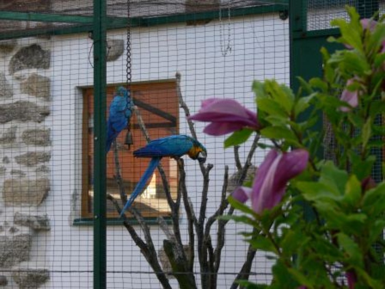 In dem geschlossenen Innenhof des typischen Waldviertler Dreiseithofes mit Steinbrunnen wird man von den Papageien, den Katzen und Hunden begrüßt.