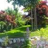 Die von Beeten eingefasste Terrasse ist mit Gartenmöbeln ausgestattet, auf der Liegewiese können Sie in Liegestühlen die Sonne genießen.